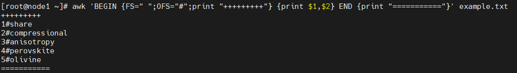 awk 'BEGIN {FS=" ";OFS="#";print "+++++++++"} {print $1,$2} END {print "==========="}' example.txt