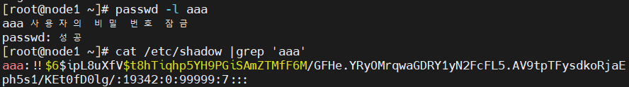 정보를 보면 앞에 !! 라고 느낌표 두개 있는 부분이 패스워드 잠금됐다는 뜻이다.