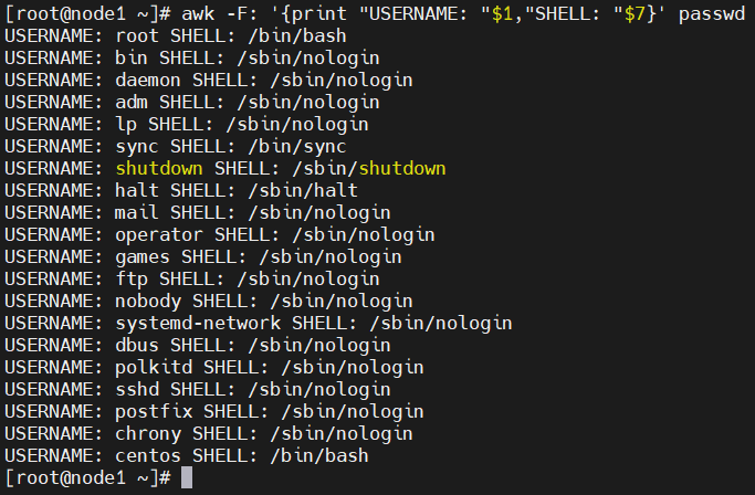 awk -F: '{print "USERNAME: "$1,"SHELL: "$7}' passwd