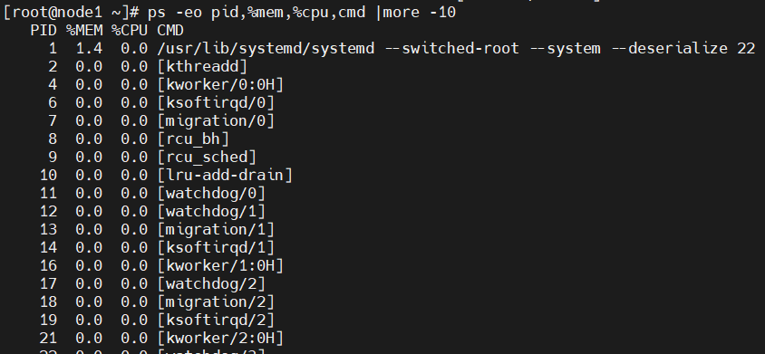 ps -eo pid,%mem,%cpu,cmd |more -10