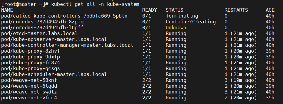사실 문제가 발생한 어제는 weave-net 부분도 올라와있지 않았는데 하루 지나고 부팅하니 이 부분은 돼있다.