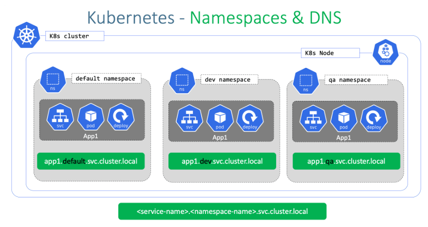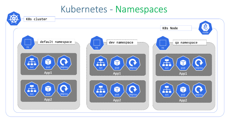 쿠버네티스에서, 네임스페이스 는 단일 클러스터 내에서의 리소스 그룹 격리 메커니즘을 제공한다. 리소스의 이름은 네임스페이스 내에서 유일해야 하며, 네임스페이스 간에서 유일할 필요는