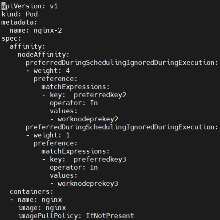 - preferredDuringSchedulingIgnoredDuringExecution: 스케줄러는 조건을 만족하는 노드를 찾으려고 노력한다. 해당되는 노드가 없더라도, 스케줄러는 여전히 파드를 스케줄링한다.