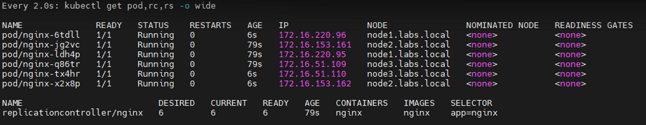 yaml파일의 replicas: 3 부분을 6으로 바꾸면 금방 6개의 파드를 생성해낼 수 있다.