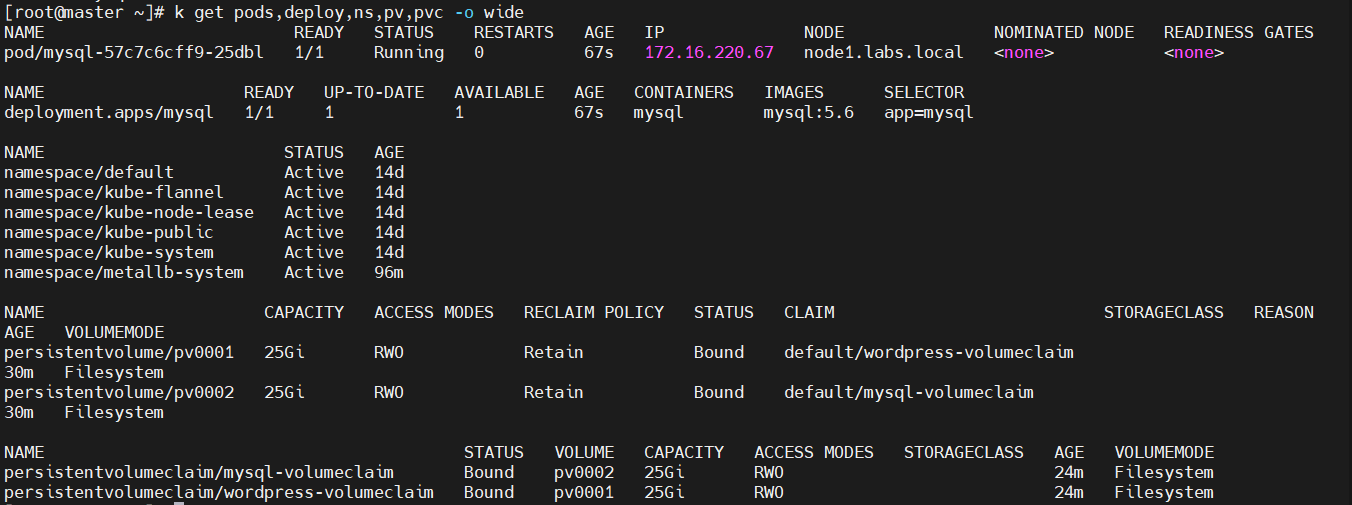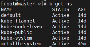 다음과 같이 네임스페이스를 확인하면 metallb-system Active 상태 확인 가능