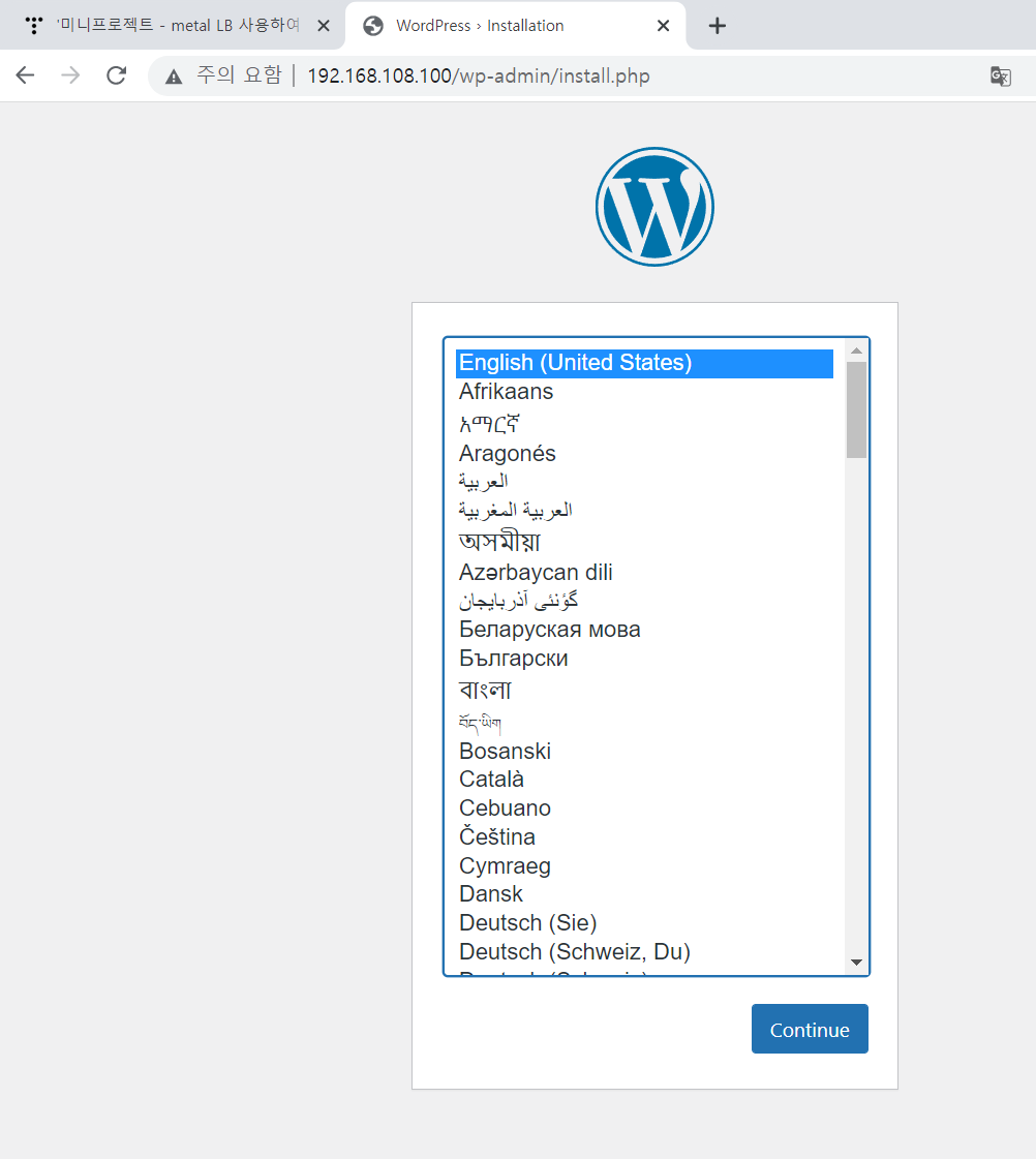 Wordpress 가 기동된 Pod 의 노드 IP 와 Wordpress 서비스의 external-ip 로 웹 브라우저를 통해 접속한다.