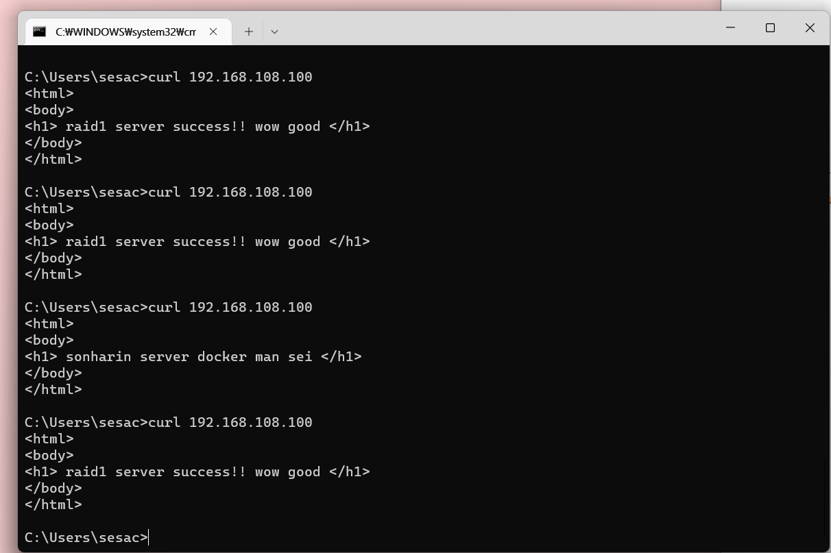 nginx web-0과 web-1 페이지 내용 다르게 하고 호스트 pc의 cmd창에서 확인해본다.