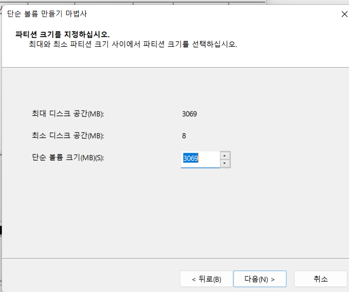 할당되지 않음으라고 돼있는 부분에 마우스 오른쪽 버튼을 클릭하여 새 단순 볼륨을 만든다.