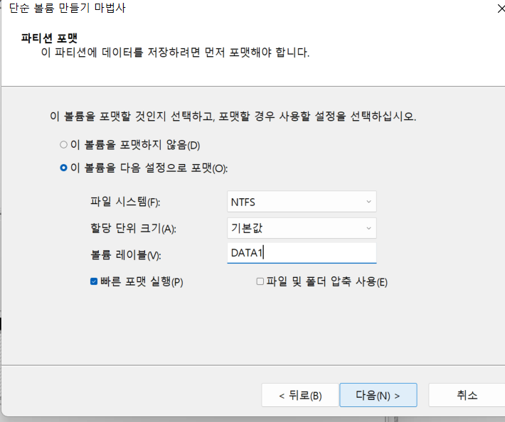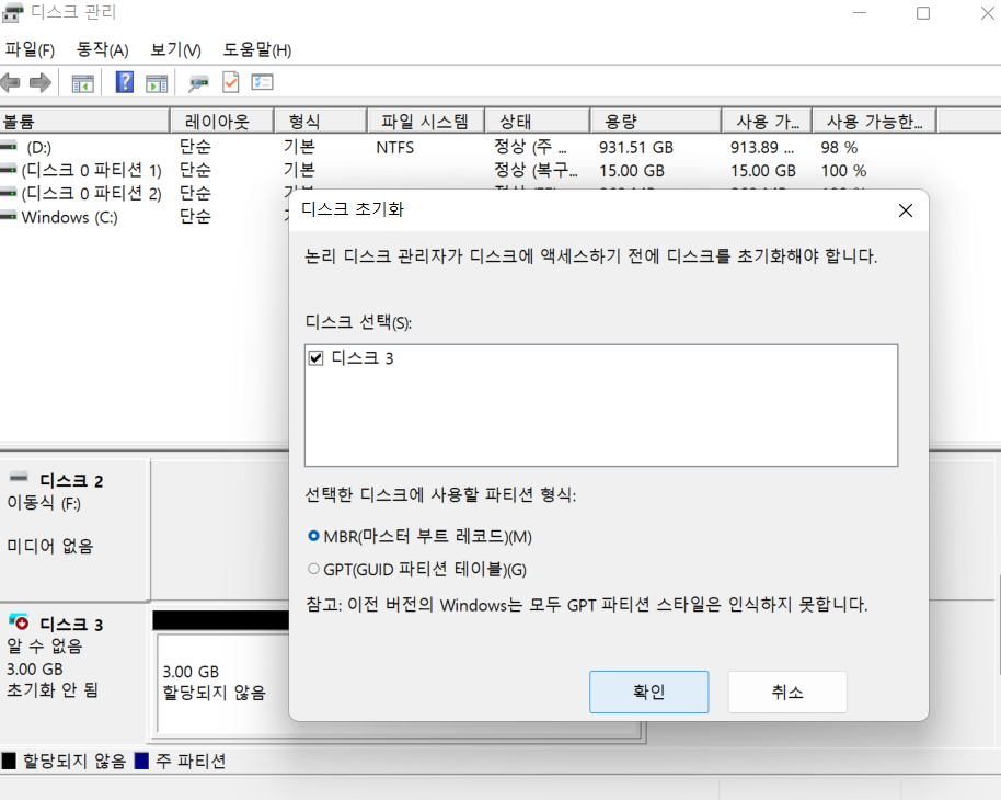 여기까지 하면 포멧 되는 동안 조금 기다렸다가 파티션이 생성된 뒤 잘 쓰면 된다.