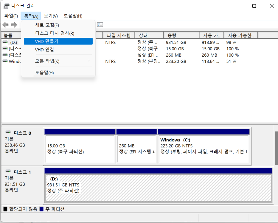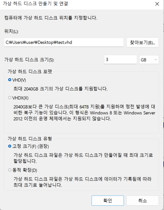 동작- VHD 만들기를 누르면