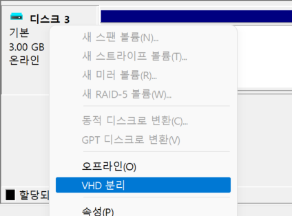 만약 파티션을 지우고 싶다면 만들어진 디스크에 VHD 분리를 눌러 삭제하면 된다.