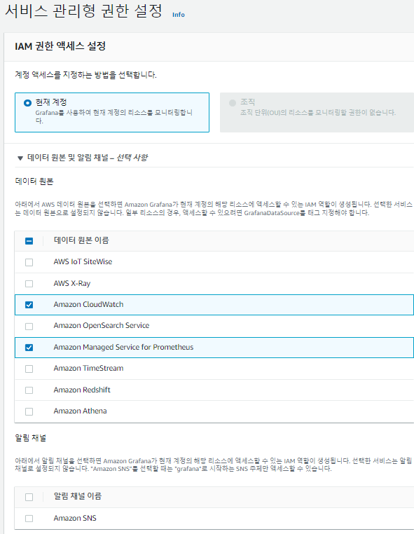 사용할 AWS 데이터 원본을 선택하며 알림 태널로 SNS를 선택할 수도 있다
