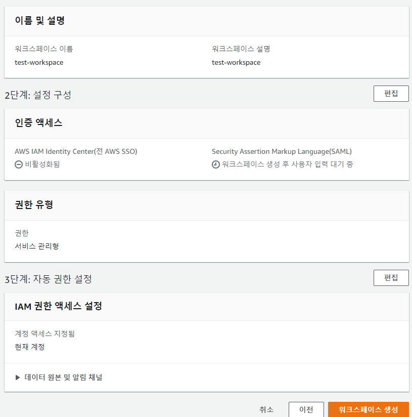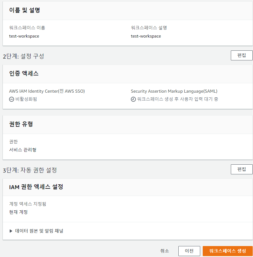 - Amazon Managed Grafana 콘솔에 접속하고 워크스페이스 생성 버튼을 클릭