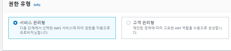 권한 유형은 서비스 관리형과 고객 관리형으로 선택이 가능합니다. 실습에서는 서비스 관리형으로 선택하고 진행.