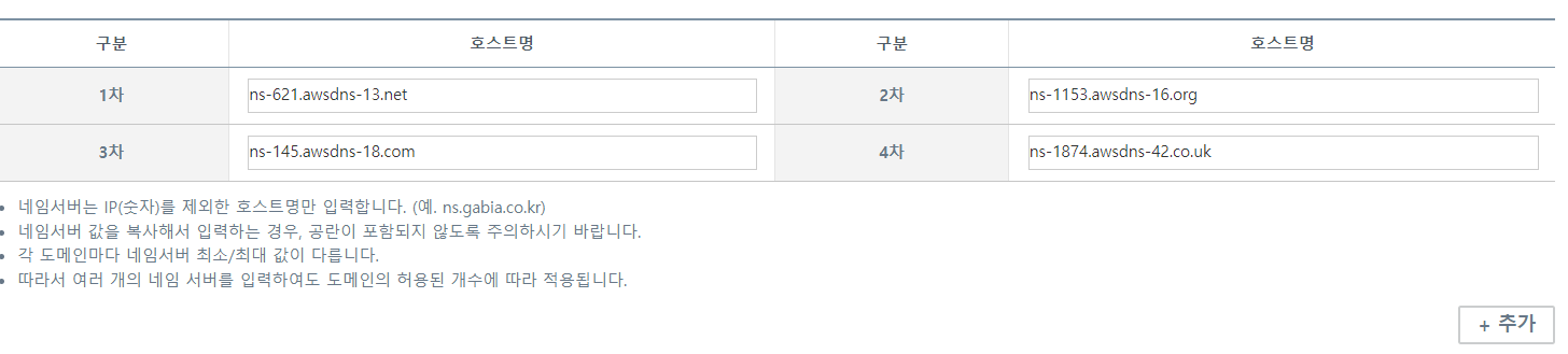NameServer의 경우, 호스팅업체의 네임서버를 사용해도 되지만 특별하지 않으면 AWS 네임서버 사용하는 것이 좋다.
