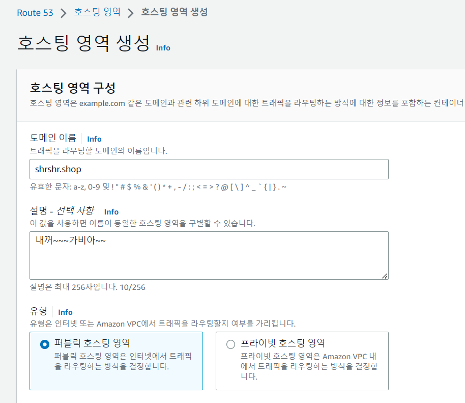 우선 도메인을 관리/처리 해주는 route53의 기능상 도메인을 먼저 입력해본다.