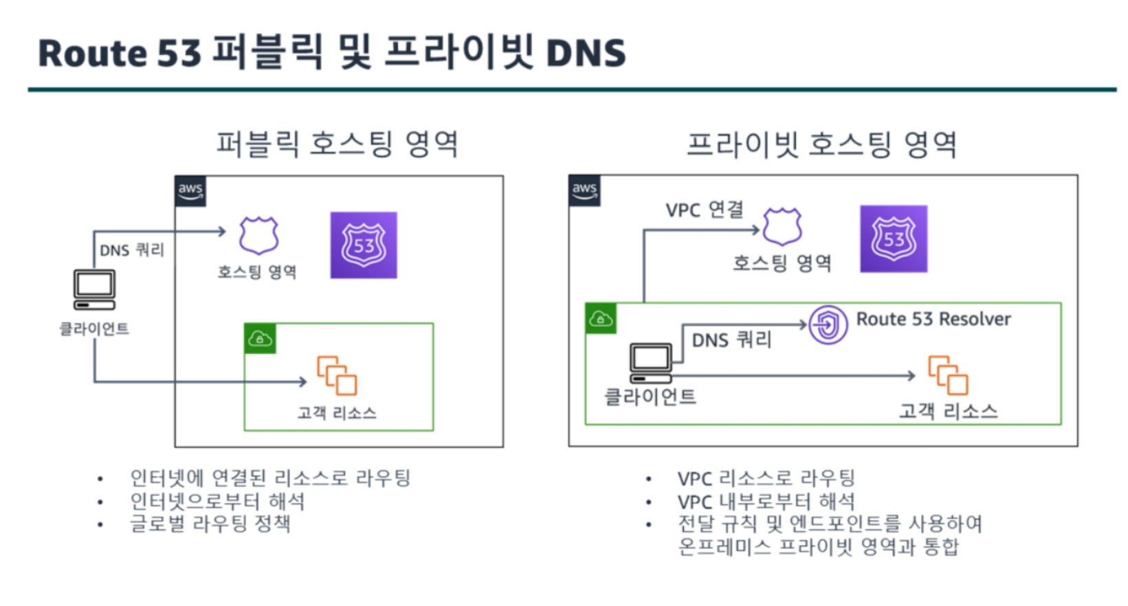 Route 53은사용자요청을Amazon Elastic Compute Cloud(Amazon EC2) 인스턴스, Elastic Load Balancing(ELB) 로드밸런서또는Amazon Simple Storage Service(Amazon S3) 버킷처럼AWS에서실행되는인프라에효과적으로연결하며, 사용자를AWS 외부의인프라로라우팅하는데에도사용할수있다.