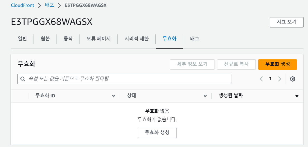 Invalidations 탭에는 객체 무효화에 대한 배포의 구성이 포함되어 있다.