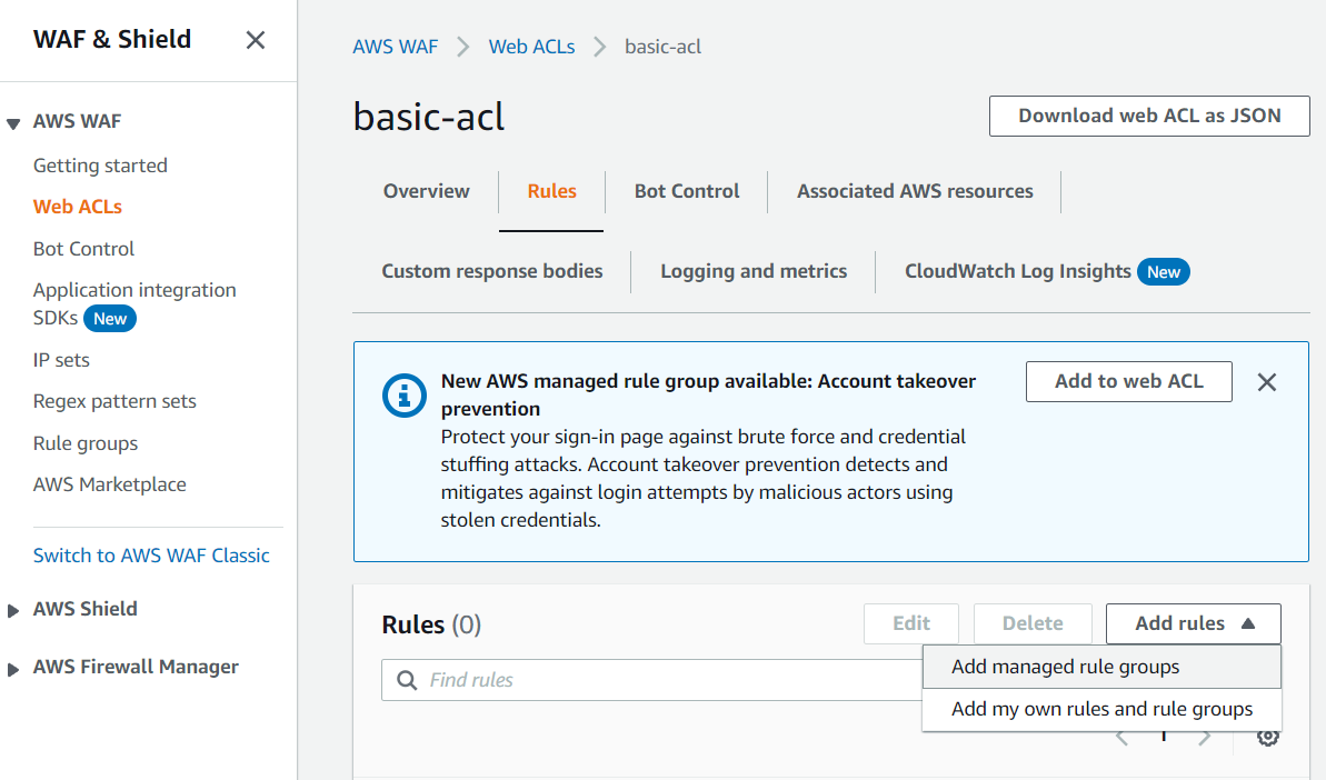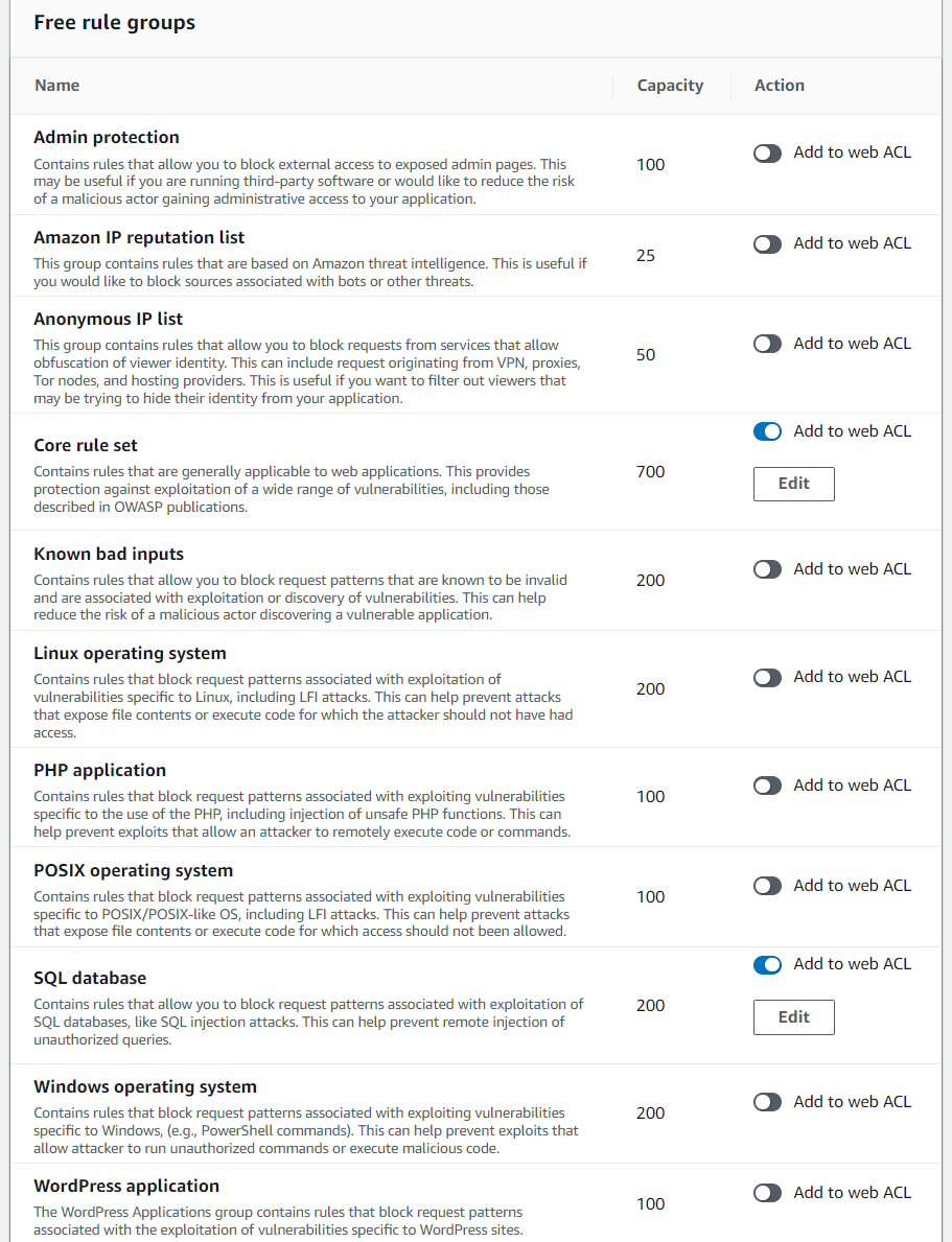 만들어진 ACL 룰 눌러서 들어간다. 거기에 룰 텝 눌러서 managed rule groups을 구색 맞추기용으로 넣어주자.