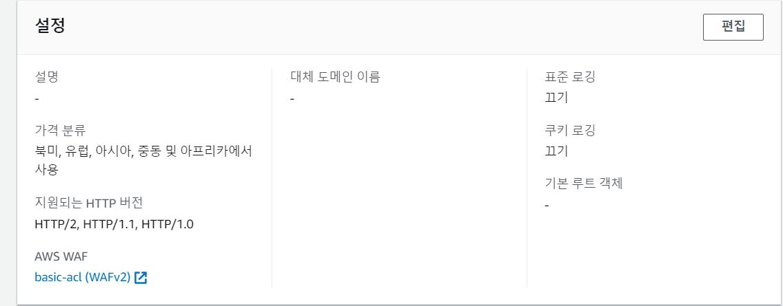 아까 만든 클라우드프론트 들어가서 WAF 부분 비어있는 저부분 편집 누른다.