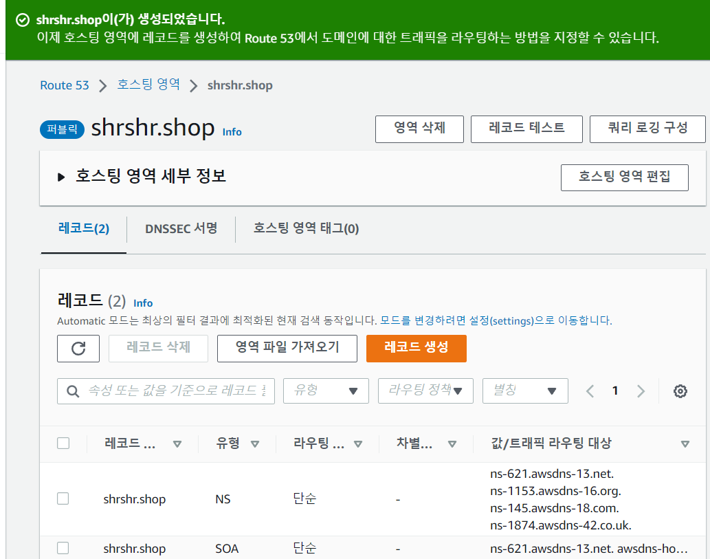 생성된 호스팅 영역에는 다음과 같이 NS와 SOA 가 자동으로 생성되어 있다.