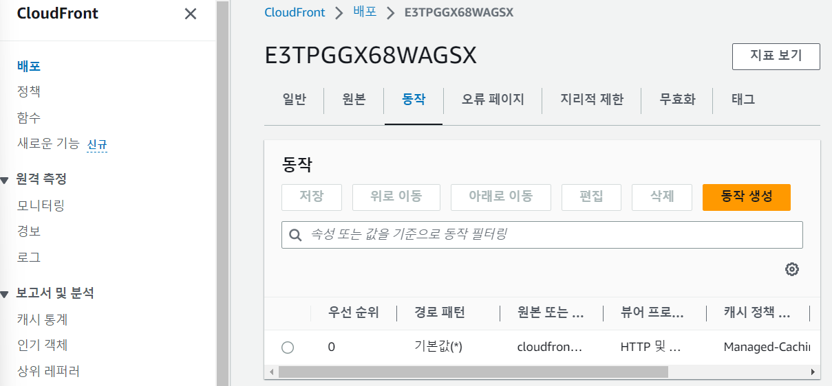 Behaviors는 특정 콘텐츠를 제공할 오리진, 캐시에 있는 콘텐츠의 TTL(Time-To-Live), 다양한 헤더의 처리 방법 등 콘텐츠에 대한 요청이 있을 때 CloudFront 배포가 수행하는 작업을 정의한다.