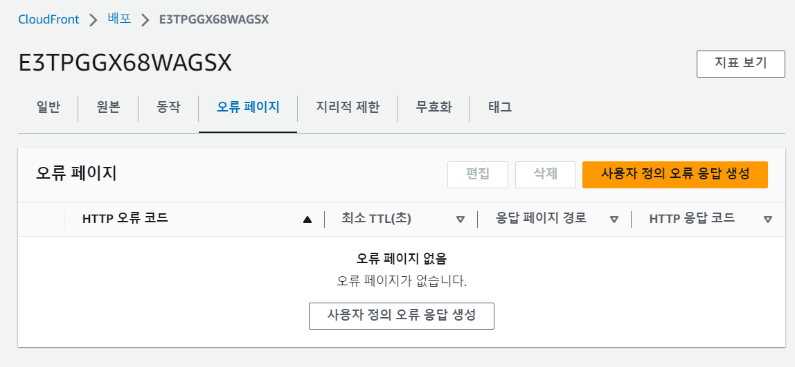 Error Pages 탭에는 요청된 콘텐츠로 인해 HTTP 4xx 또는 5xx 상태 코드가 발생할 때 사용자에게 반환될 오류 페이지가 자세히 설명되어 있다.
