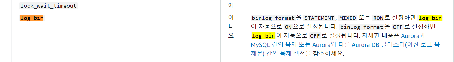 제일 중요한 bin-log값은 EC2로 오로라DB에 접근해서 보면 off 상태였는데 (show variables like '%log_bin%';)
