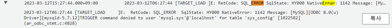 2023-03-12T06:27:44 [TARGET_LOAD ]E: RetCode: SQL_ERROR SqlState: HY000 NativeError: 1142 Message: [MySQL][ODBC 8.0(w) Driver][mysqld-5.7.12]TRIGGER command denied to user 'mysql.sys'@'localhost' for table 'sys_config' [1022502] (ar_odbc_stmt.c:4828)