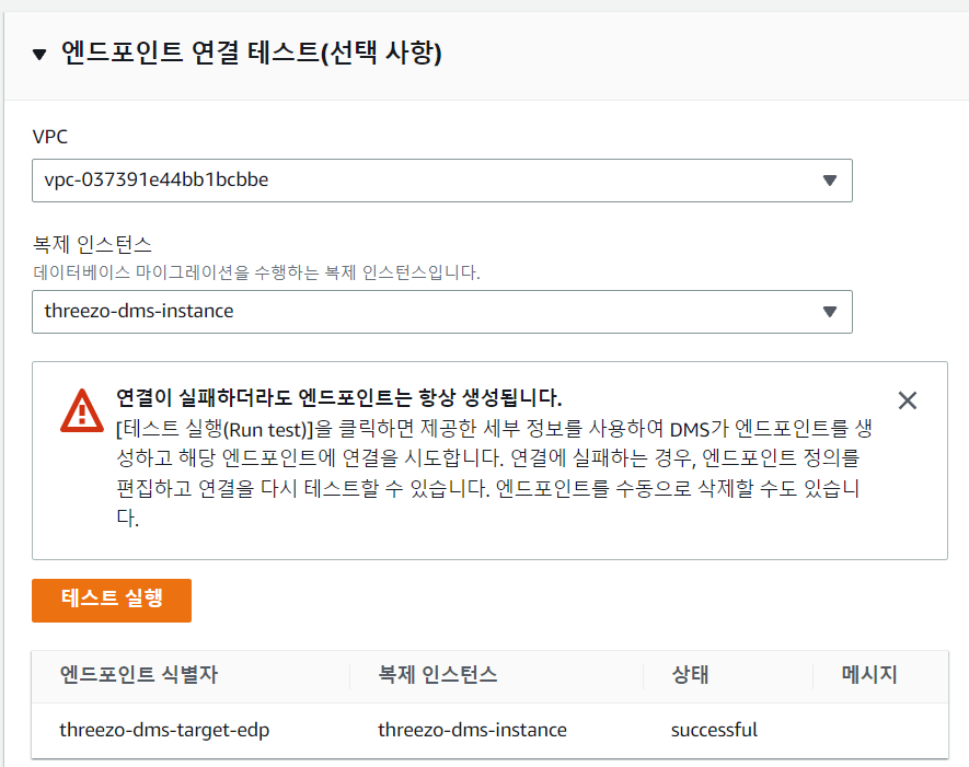 엔드포인트 연결테스트 진행 후 successful이 나온 경우 성공적으로 연결된 것이다