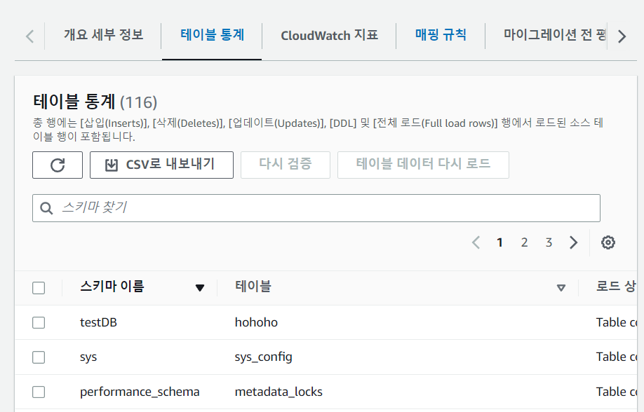 온프레미스의 DB에 testDB를 추가하고 hohoho테이블도 넣어보니 바로 aws상 목록에 반영된다.