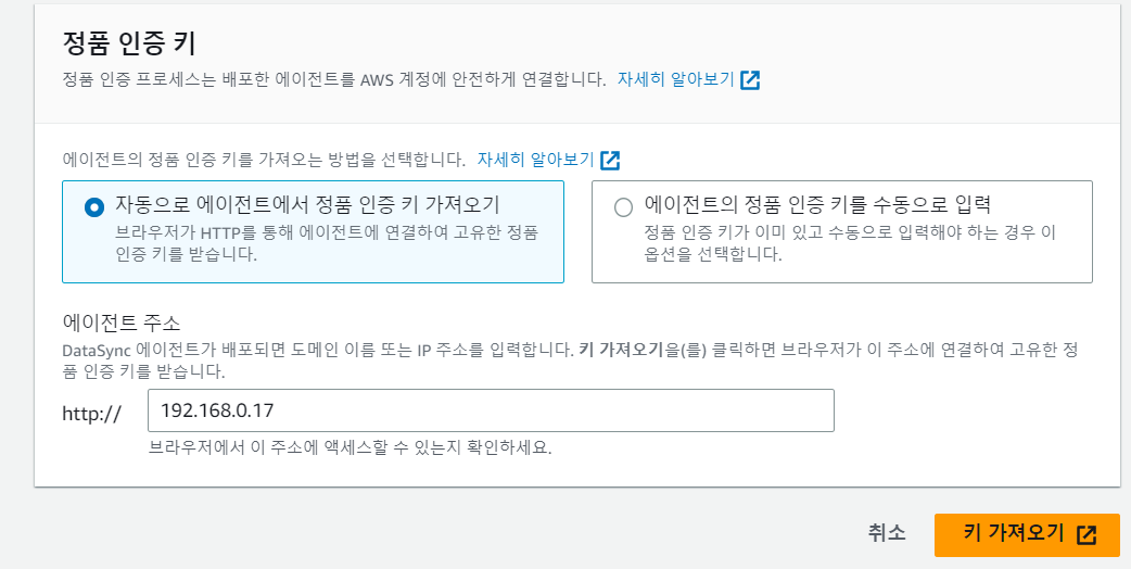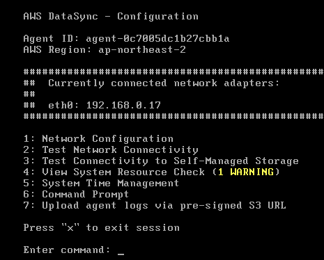 Datasync Agent 설정 모범 사례. (내용중 로컬 콘솔이라는 링크 누르면 로컬cli 창에서 해야되는 명령어 보기 가능)