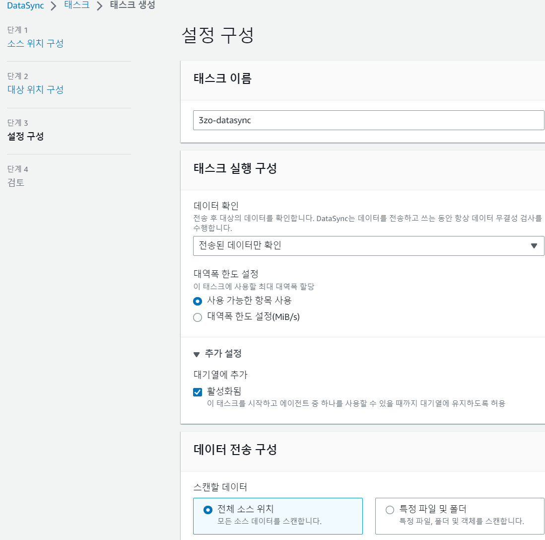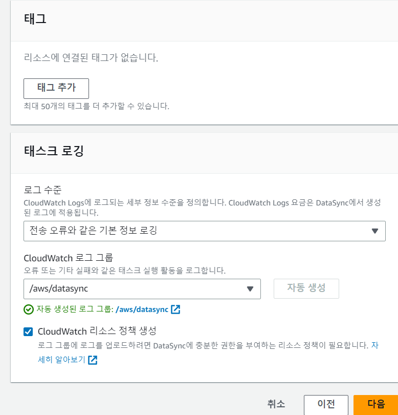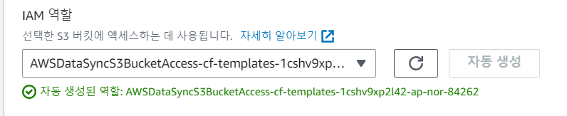 아래 IAM 역할은 S3조작에 대한 권한을 datasync 서비스에 부여해줘야하는데, 자동생성 누르면 편하다.