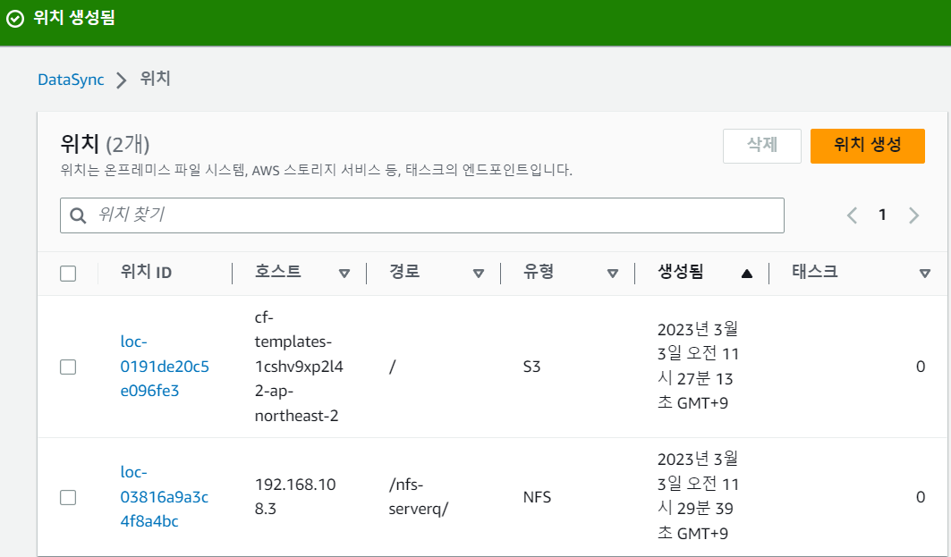 두 개의 위치가 만들어졌다. 하나는 NFS 서버용이고 다른 하나는 S3 버킷용이다.