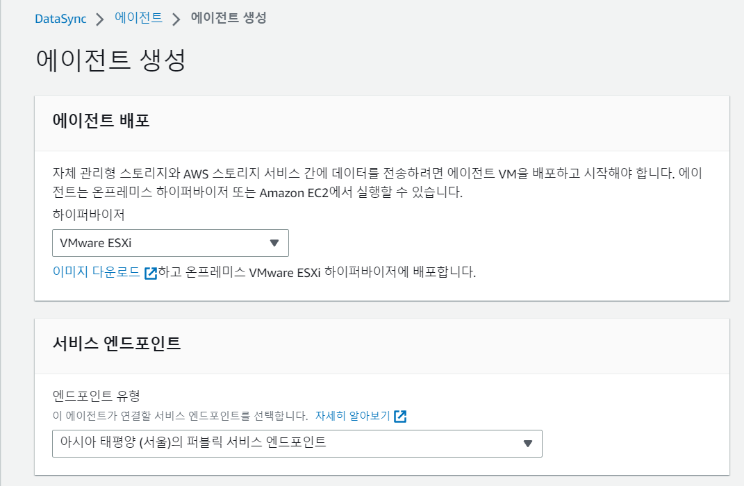 Datasync 에이전트에 대한 서비스 엔드포인트 선택과 각자 연결법