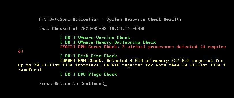 DataSync 에이전트는 충분한 리소스가 할당되었는지 자동으로 확인한다.