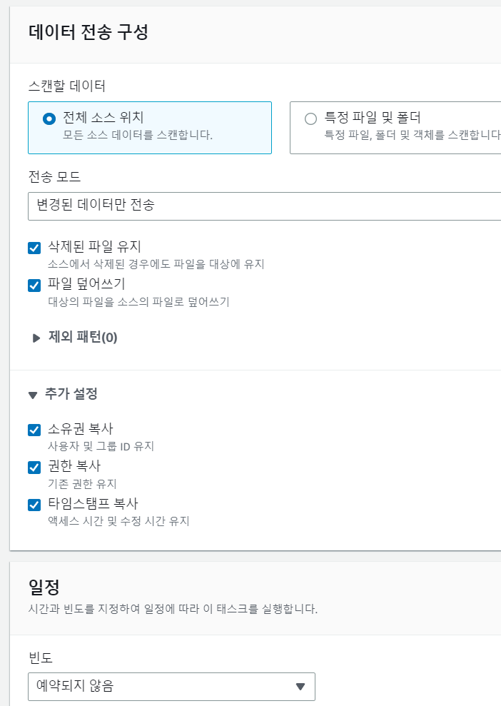 최소 설정 가능한 주기가 1시간이라서 datasync는 실시간 양방향 싱크에 부적합하다.