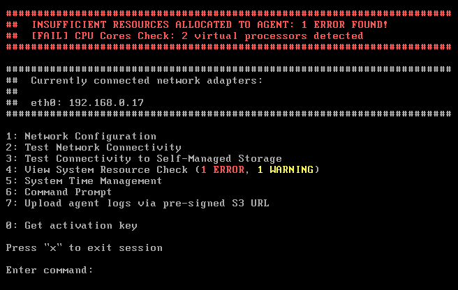 부팅 시 시스템 리소스 검사 중에 오류가 발견되면 에이전트는 로컬 콘솔에 로그인하는 즉시 빨간색 배너를 표시한다.