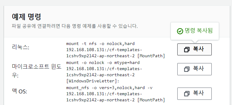 다 만들어지면 아래와 같은 파일공유 템플릿이 있는데, 눌러보면 아래와 같이 마운트 명령어를 예제로 준다.