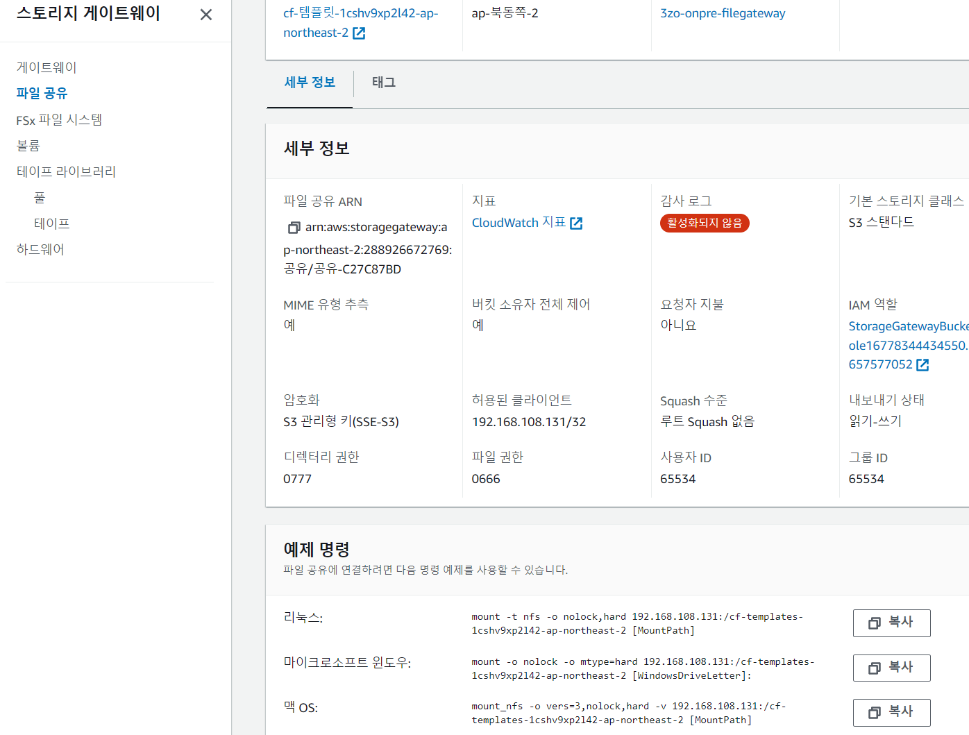 아까 스토리지 게이트웨이 파일공유 템플릿에서 리눅스 마운트 명령어를 복사해다가