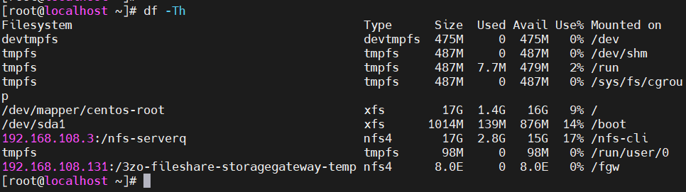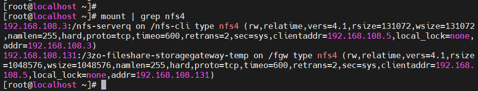 mount -t nfs -o nolock,hard 192.168.108.131:/3zo-fileshare-storagegateway-temp /fgw