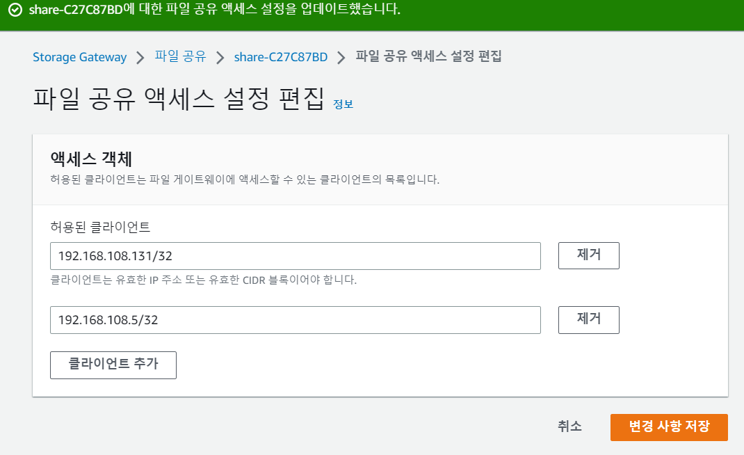 3. 파일공유에 허용된 클라이언트 목록에 어플리케이션 서버 ip 추가.