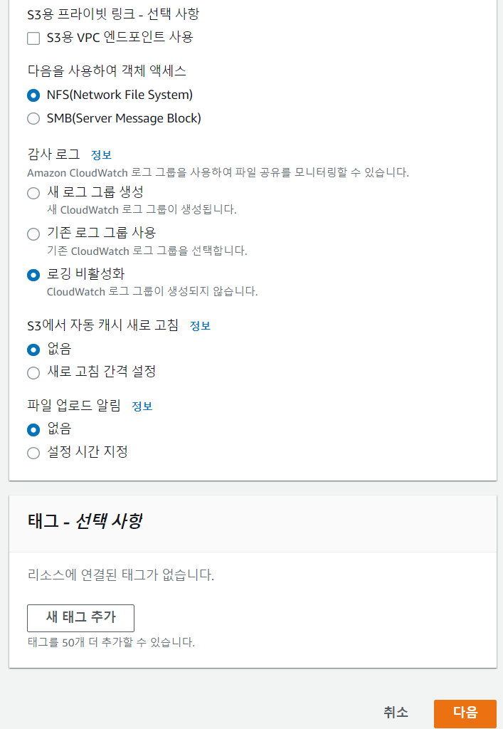 여기까지 아까 만든 게이트웨이랑 Datasync 했던 S3버킷 골라주고 아래 하얀 버튼을 눌러준다.