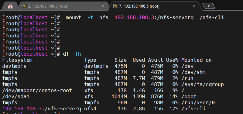 에플리케이션 서버 (nfs-client) 192.168.108.5 는 nfs-server 192.168.108.3에 nfs 마운트가 이미 돼있는 상태다.