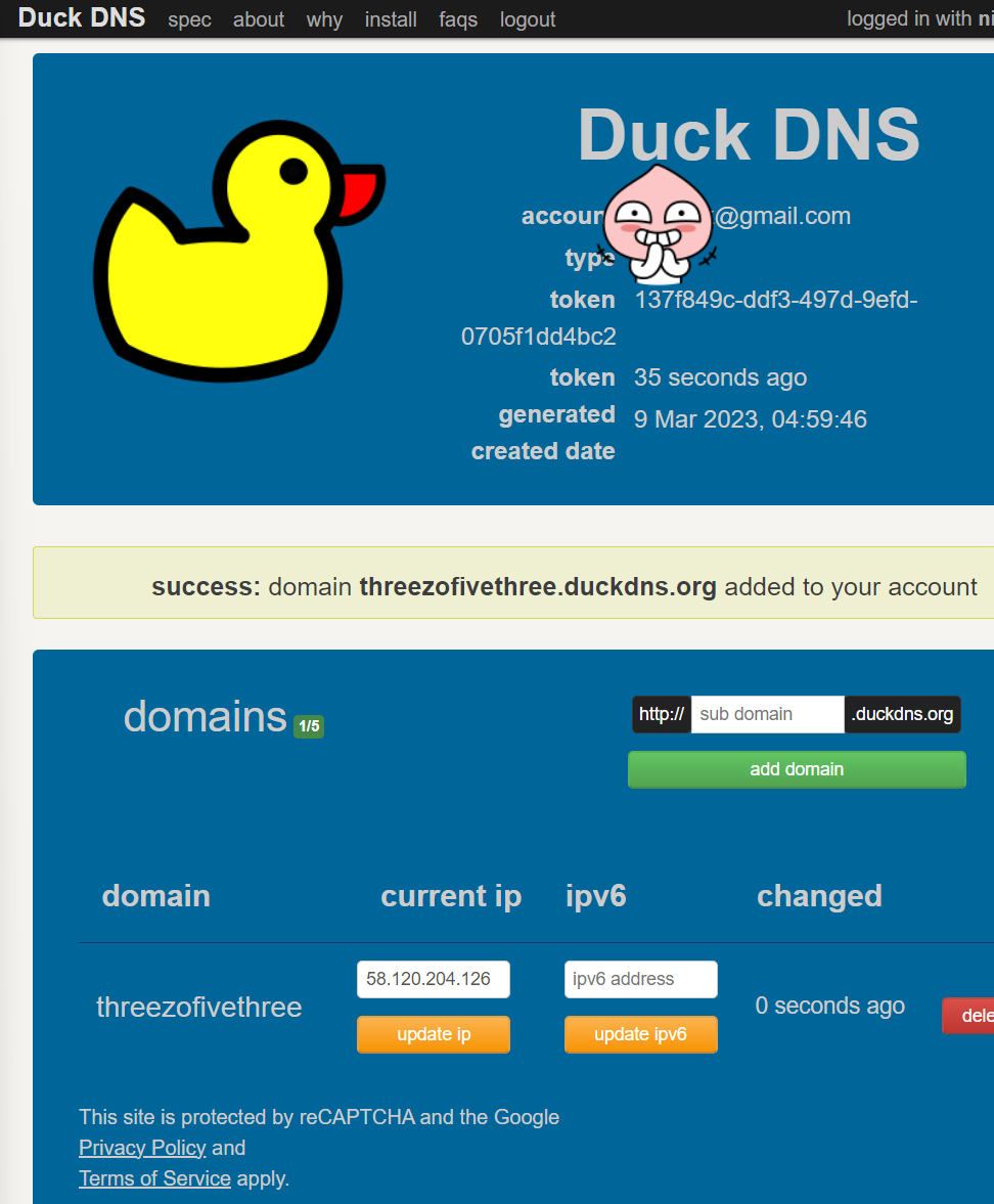 그래서 대체품으로 Duck DNS에서 무료 도메인 서비스를 이용할 수 있다.