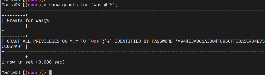 10. 아래 사진과같이 was라는 계정은 모든 ip에 대해 권한을 받음