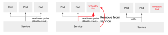 예를 들어 쿠버네티스 서비스에서 아래와 같이 3개의 Pod를 로드밸런싱으로 서비스를 하고 있을때, Readiness probe 를 이용해서 서비스 가능 여부를 주기적으로 체크한다고 하자. 이 경우 하나의 Pod가 서비스가 불가능한 상태가 되었을때, 즉 Readiness Probe에 대해서 응답이 없거나 실패 응답을 보냈을때는 해당 Pod를 사용 불가능한 상태로 체크하고 서비스 목록에서 제외한다.