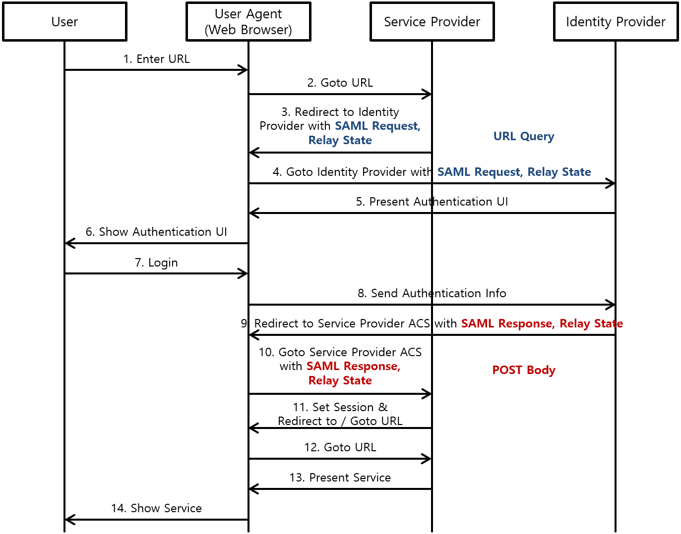 - 10, 11 : User Agent는 HTTP Post 요청을 통해서 ACS URL로 접근한다. Service Provider의 ACS는 HTTP Post 요청의 Body에 존재하는 SAML Response의 Assertion 정보를 통해서 Session을 설정한다. 또한 HTTP Post 요청의 Body에 존재하는 Relay State를 통해서 User가 처음 접근을 시도했던 Service Provider의 URL을 찾아내고 다시 Redirect 시킨다.