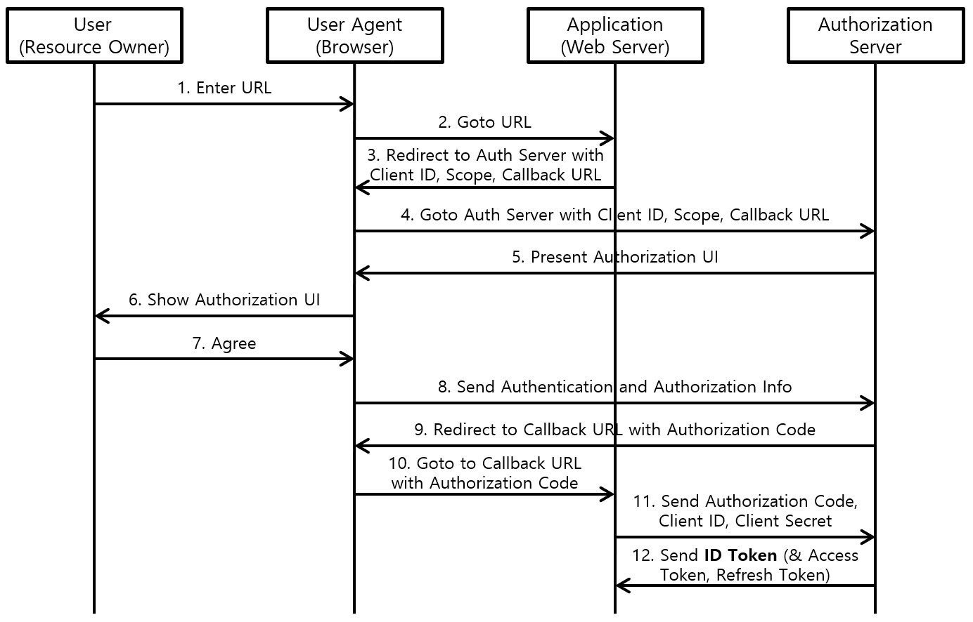 OIDC의 ID Token 발급 과정을 나타내고 있다. ID Token의 발급 과정은 OAuth 2.0의 Access Token을 발급받는 과정과 거의 동일하다. 단 마지막 12번 과정에서 Authorization Server로부터 Access Token 대신 ID Token이 App에게 전달된다는 점이 다르다. 필요에 따라서는 App은 ID Token 뿐만 아니라 OAuth 2.0의 Access Token, Refresh Token도 같이 전달받을 수 있다.