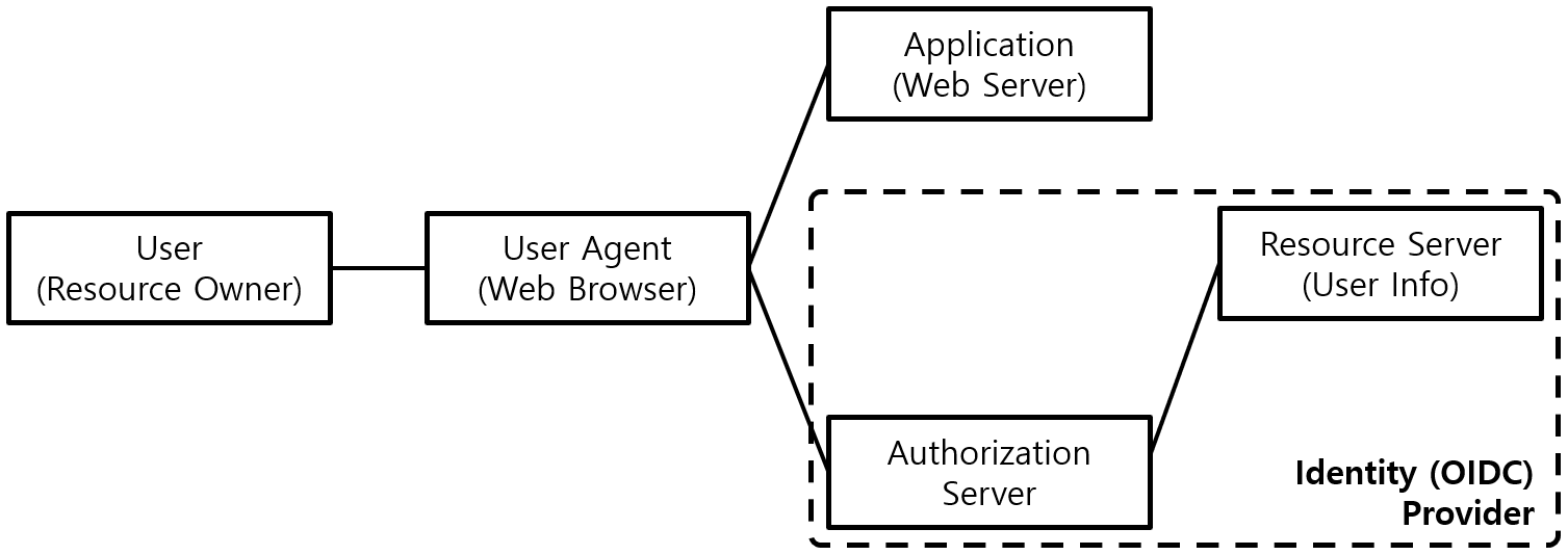 OIDC는 OAuth 2.0을 기반으로 하기 때문에, OIDC의 Component는 OAuth 2.0 Component와 거의 동일하다. OIDC에서는 App에게 인증 정보를 제공하는 구성 요소를 Identity (OIDC) Provider라고 명칭한다. Identity Provider는 OAuth 2.0 관점에서는 인증에 필요한 User 정보를 저장하고 있는 Resource Server와 Authorization Server의 조합으로 구성된다. 여기서 Authorization Server는 App에게 Access Token을 통한 인가 정보뿐만 아니라, User의 정보를 저장하고 있는 ID Token이라고 불리는 Token을 App에게 전달하여 인증 Server의 역활도 수행한다.